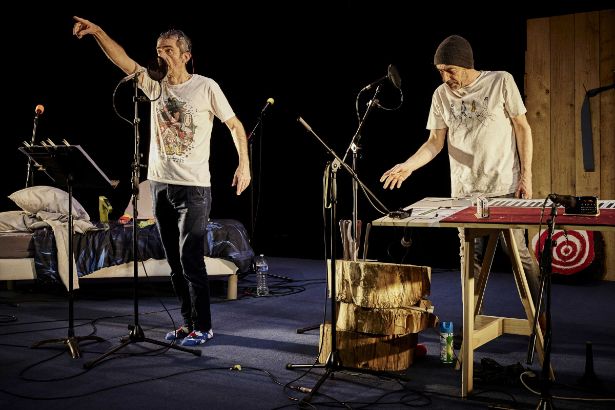 Après le réjouissant Dad is dead, Arnaud Saury revient avec une nouvelle proposition, forcément inclassable. Il a imaginé un espace de jeu, une chambre de fiction où peuvent advenir tous les rêves et tous les fantasmes. Aujourd’hui, la chambre abrite un studio de radio pirate. On y parle de lancers de couteaux, de risque, de thérapie conjugale, des difficultés d’un couple qui n’en est pas un. Bref, Arnaud Saury nous invite à nouveau à embarquer dans son univers circassien foutraque, pour nous réjouir de son humour acide et de son inventivité iconoclaste.